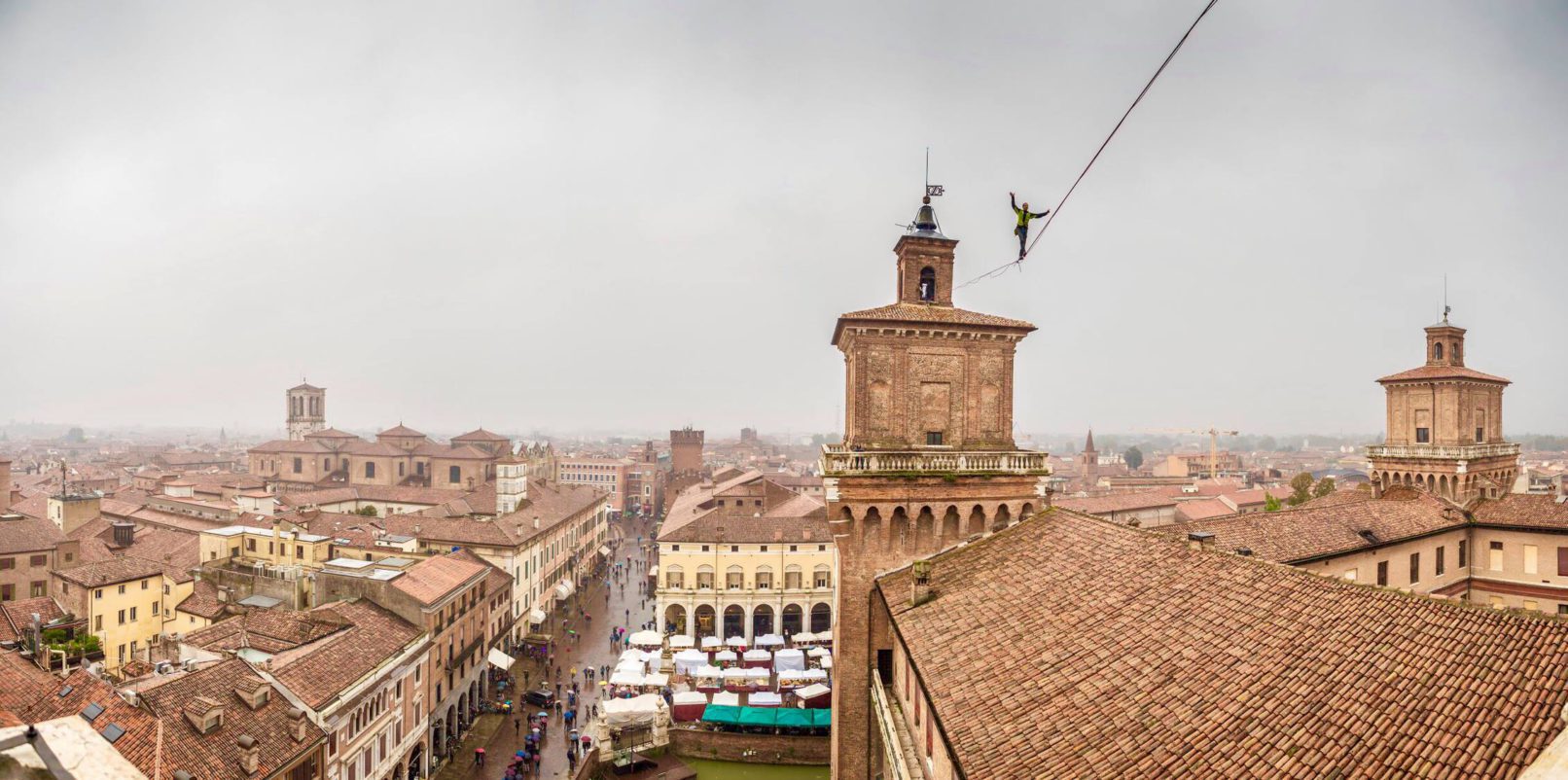 Highline at the Internazionale Festival in Ferrara 2018 with the support of Montura: the city hanging by a thread. Ferrara residents and tourists with their noses up to admire the performance of mountaineer and videomaker Alex D’Emilia in a walk on the wire between the towers of the Estense Castle.