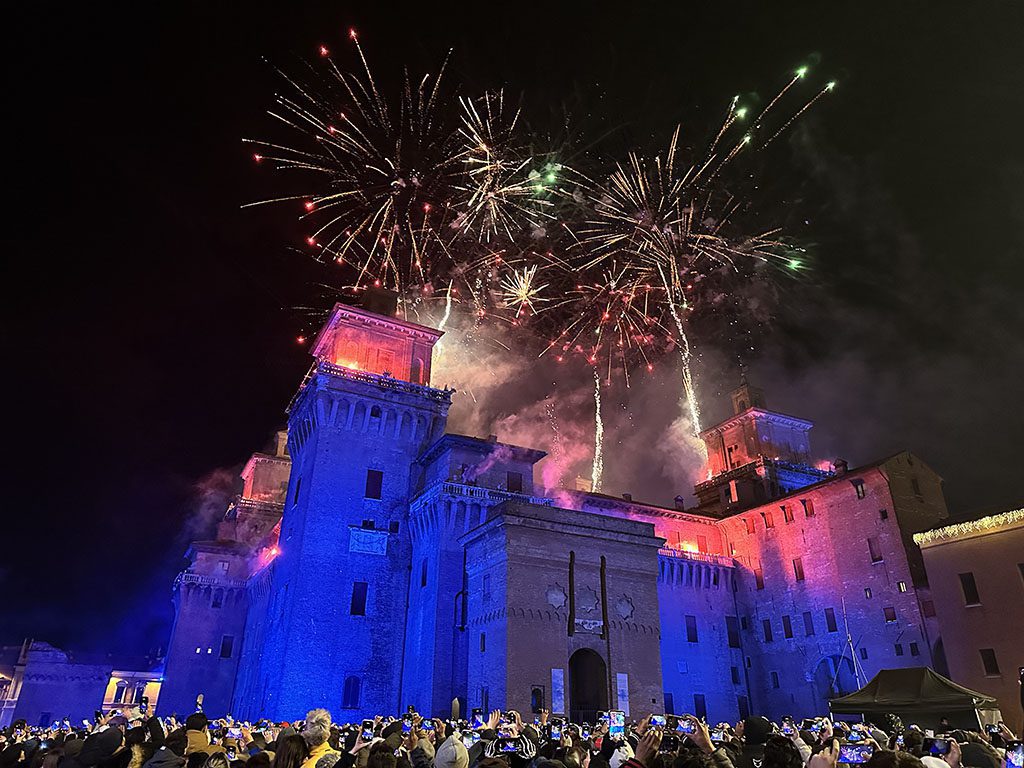 Allo scoccare della mezzanotte, il Castello Estense si anima di luci e fuochi in uno show piromusicale riconosciuto come il più emozionante in tutta Italia. Uno spettacolo unico ed indimenticabile, massima espressione della pirotecnia con una durata di circa 20 minuti e brevi pause fra i brani musicali per i controlli di sicurezza.
